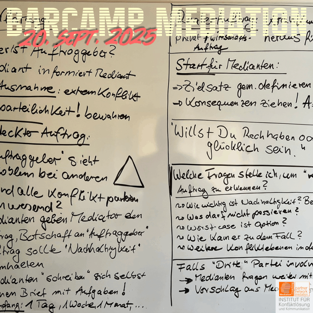 Was bleibt, ist die Erkenntnis: Das Format Barcamp funktioniert – auch in der Welt der Mediation. Es schafft Raum für Begegnung, Reflexion und Weiterentwicklung, jenseits von Zertifikaten und Lehrplänen.